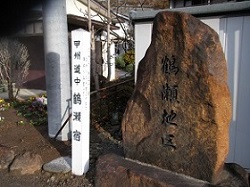 関所の先右手に鶴瀬地区の石碑と鶴瀬宿の標柱があり、「江戸より第三十一宿、江戸へ三十里二十七丁、甲府へ五里一丁」とある。この場所が鶴瀬本陣跡でもあったそうだ。
