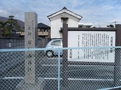 遠妙寺から数分の右側駐車場が石和本陣跡で、説明板によると、明治13年の火災で本陣建物が焼失。本陣土蔵だけが焼け残ったのだそうだ。