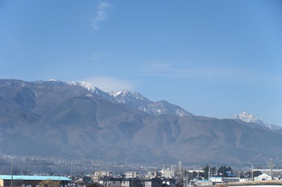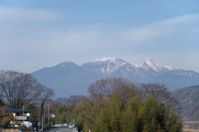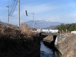 静かな旧道から国道に合流するとすぐに牧原交差点がある。地図で見ると日野春駅までの道がどうなっているのか少々不安になり、確かめるため交差点近くにあった武川駐在所に駆け込んだ。駐在さんは親切丁寧に日野春駅までの道を教えてくれる。駅は、七里岩の上のほうにあるので、ここから30分ほどの登りとなる。荒々しい釜無川を渡った先は、一日の終わりとしては結構きつい上りだが、坂の途中から、今日一日の旅にずっと道連れになってくれた富士山や甲斐駒、鳳凰三山のシルエットが一段と大きく見える。