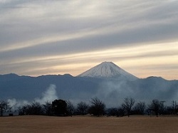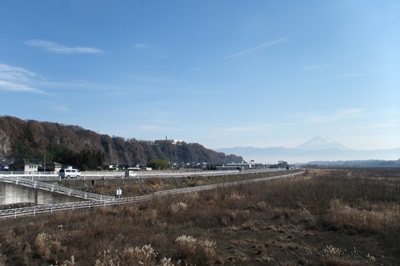 桐沢橋の途中から眺めると、遮るもののない河川敷の向こうに、富士山がくっきりと見える。