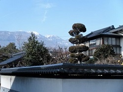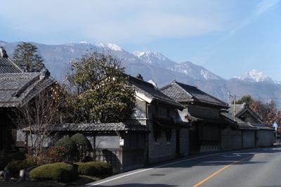 塩崎駅入口を過ぎ、少し進むと、鳳凰三山や甲斐駒ケ岳をバックに街道沿いには蔵を持つ大きな屋敷が続いている。この辺りの蔵は、街道に面して建ち、屋敷を取り囲んでいて防火壁の様になっていて、重厚で独特な趣がある。