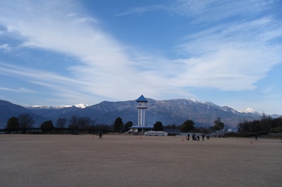 ちょっと長い赤坂を登りきると、広々とした赤坂台公園がある。公園の奥のほうに何やらかなり高い塔が見えたのでちょっと行ってみると、エレベータで上る展望台からは360度の眺望が広がる絶景がそこにあった。北に八ヶ岳、南に富士山、西には白峰三山や甲斐駒ケ岳を背にする鳳凰三山、北東には茅ヶ岳や金ヶ岳など。