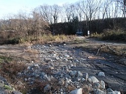 堰に沿った道は山へと入って行き、舗装も途切れて砂利道となる。その先、戸沢川がせせらぎのようになっているところで、下円井側へ渡渉する。