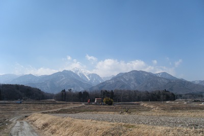 白洲小学校入口あたりの土蔵を構えた大きな旧家を眺めながら進むと、やがて見渡す限り広がる畑の中の一本道となり、南の方には甲斐駒ケ岳に連なる山々が雄大な姿を見せている。