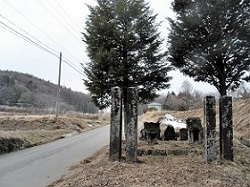 とちの木村の外れに尾片瀬神社があり、少し先の街道沿いに4本の石柱と小さな石祠が鎮座し、祠の後ろには複数の双体道祖神が置かれている。