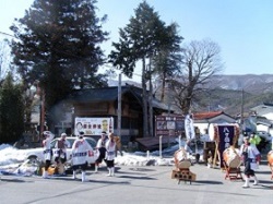 すぐ先左側に神社が二社並んでいる。鈿女(おかめ)神社と三輪神社で、ちょうど祭りの日らしく、大勢の人が駐車場広場に集まって屋台や太鼓の準備をしている最中だ。