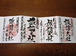 ここでは、御朱印帳とともに小さな菓子箱のようなものを差し出された。無言で渡されたため、どういうことなのか分からず、ちょっと戸惑ったが、何かご褒美をもらったような気分になり、ありがたく頂戴した。後で知ったが、この4社で御朱印をいただくと、御神紋入り落雁を頂けるということだそうだ。兎にも角にも、この日、上社前宮・本宮、下社秋宮・春宮、4社を参拝して御朱印をいただき、甲州街道歩き旅ゴールインに花を添えることができた。