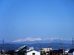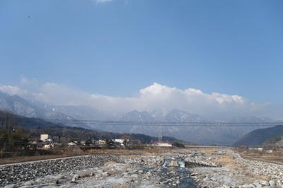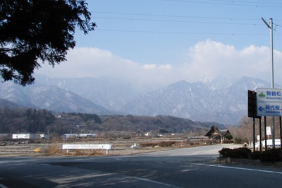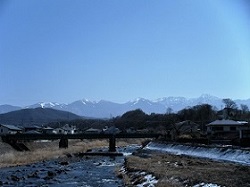 上川にかかる上川橋を渡り、いよいよ茅野市街地に入っていく。橋の上からは、遠くに穂高連峰が臨め、反対側を見ると八ヶ岳が迫っている。
