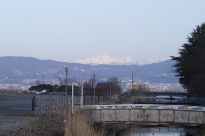 中央本線を跨線橋で渡ったらすぐ左折し線路に沿って下って行く。JRの変電所前を通り、のぞみ大橋の下をくぐってしばらくは宮川に沿った田圃の続くのどかな道を進んで行く。眼を前方に向けると、はるか遠くには穂高が臨める。