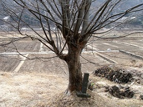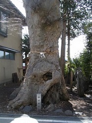この先、酒屋の脇に珍しい大ケヤキがあって、幹の太い葉の落ちたケヤキが左手に見える。根元には甲州街道の石柱があり、目通りには注連縄が巻かれている。このケヤキ、中身が空洞で表皮だけで生きているらしい。