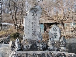 しばらく行くと、万休院から下りてくる道との合流点には万休院西口の石塔群が立っている。この先は新屋敷の集落で、静かな街道が続く。