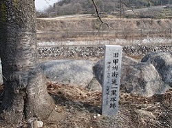 しばらく行くと、右手に山口関所跡がある。甲州二十四ヶ所の口留番所の一つで、信州口を見張り、信濃と甲州の国境警備の役割を担った。天文10年(1546)の武田信玄の伊那進攻の際設けられたと伝えられている。この番所では、天保7年、犬目の兵助主導の甲州騒動の暴徒がこの地に押し寄せた折、門扉を開いた判断をとがめられ、番士が「扶持召し上げられ」の処分を受けるという出来事があったという。