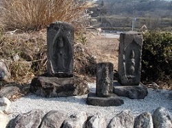 寺を過ぎて行くと、右に石仏石塔群が並んでいる。応安の古碑と刻まれた真新しい石碑の後方にある小さな方形の石碑が応安の古碑で、宝篋印塔の台石と考えられている。手前には子乃神や九四天と刻まれた石塔が並び、後方には道祖神、五輪塔等多くの石仏が祀られている。