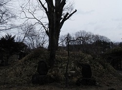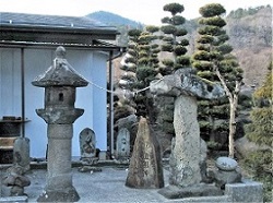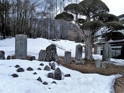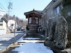 カゴメ工場の前を通り、火の見櫓の先をまっすぐ下って行くと左手に形の良い赤松があり、そこに金山大権現が祀られている。金山大権現は、鍛冶にまつわる守護神で、槌のやり取りから夫婦和合の神とも云う。さらにその先には、半ば雪に埋まっているが、無数の石塔石仏が集められ並んでいる。
