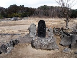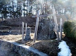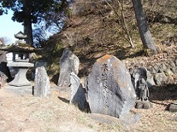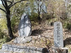 権現の森を過ぎると再び国道をしばらく歩く。左手の川向こうに49里目の木船一里塚があるというけれどわからず。国道右手の自動車工場のようなところの手前のヘアピンカーブになっている坂を上って行くと、大きな石碑があり、簡単な鳥居と御柱が4本立っている。
