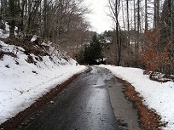 街道は大きく左にカーブし、上り坂の林道になる。すでにだいぶ上ってきているため、このあたりから徐々に街道沿いの残雪が多くなる。