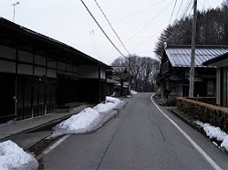 橋を渡ってすぐ左のわき道へと入って行くと下三吹地区になり、どっしりした旧家などあり、往時の趣がのこる道が続く。