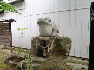 宿出口付近の久須志神社の参道には、多数の石塔とともに、珍しい石造の蛙が置かれている。