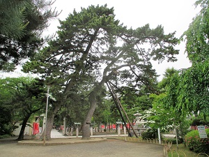 竹隈神社境内に入ったすぐのところに、芭蕉句碑と謙阿句碑が建っており、その左手には2本の立派な松が聳えている。