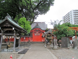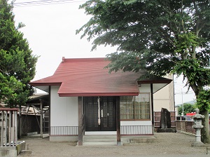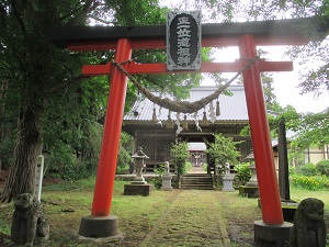 国道4号の下をくぐり、北上して常磐線の線路の下をくぐって道なりに進んでゆくと、街道左にひと際目を引く真っ赤に塗られた東武(とうたけ)神社が鎮座している。