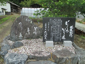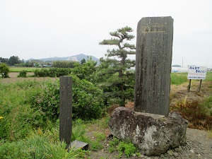 四日市場一里塚跡から先、旧道は国道と阿武隈川に挟まれる道を行き、少し先で国道から右の阿武隈川の方に分かれる。しばらく道なりにたんたんと進んで行くと、玉崎の集落を抜けて左にカーブするあたりに道標と八声(やごえ)の橋記念碑が並んでいた。