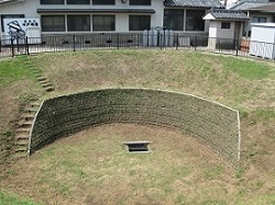 「まいまいずの井」と言われる漏斗状井戸である。まいまいずとはかたつむりのことで、井戸の水を汲むためには巻き貝の様に回りながら水際まで下りて行くような形状となっている。