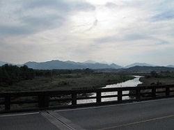 県道を越えて低地を下りて行くと、田畑の真ん中を突っ切って神流川に突き当たる。当時の渡し場跡である上肥土まで来ると、付近には橋がなく、最寄りの橋は下流に3kmほども行った藤武橋を渡るしかない。やむなく、とぼとぼと神流川堤防上の道を歩き、藤武橋を渡る。