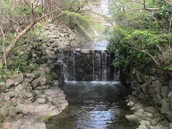 万葉歌碑の後方には白糸の滝が見える。白糸の滝は、近年整備されたらしく、その周囲の景色と相まってなかなか絵になる景観を呈している。