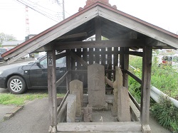精進橋を渡ってかなり分かりにくいところに残る旧道に入り、右に行く路地を入ると上宿の双代道祖神がある。