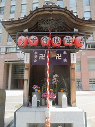 池袋駅東口をから首都高速の下を通り春日通りに出て東池袋3丁目交差点を渡ったら、帝京平成大学ビルの前の広いスペースの目立つところにぽつんと子育て地蔵が見える。