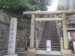 大坂を下って山手通り(環状六号)を横断すると、右手の崖に張り付いたような上目黒氷川神社の裏参道の急な階段が目に入る。この階段を上って参拝したあと、表参道の階段を下ろうとしたら、もっと急な階段であった。文化13年(1816)に造られたという階段は、明治38年の大山街道拡張の際に現在のような急階段に改修されてしまったという。