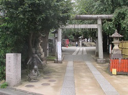 程なく池尻稲荷神社前に来ると、鳥居横に涸れずの井戸跡がある。江戸時代、どんなに日照りが続いても涸れることなく旅人の喉を潤す水に使われていたという。ここには、往時の子どもの遊ぶ像も置かれている。