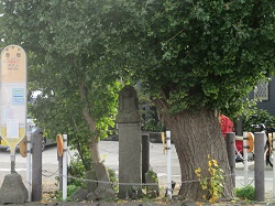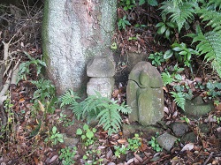 伊勢山公園横の緩い坂道を上ると、そこは大山街道と藤沢街道が交わる国分の辻で、その向こうに石塔群が見える。