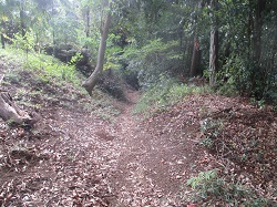 しばらく住宅地の中を進み、厚木街道を横断したところで階段を上がって少し行くと正面に車止めが置かれている。この車止めから先に古東海道の草道が残っているというので進んでみると、短い区間ではあるがまるで獣道のような道となっていた。