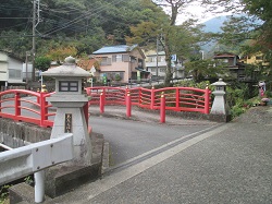 社務局を出て川沿いの道を上っていくと朱鮮やかな愛宕橋が見える。