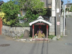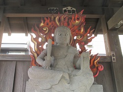 旧東海道が国道1号に合流する四ツ谷の交差点で国道を渡ったところが大山街道への分岐点で、そこには火焔光背の色鮮やかな不動明王が立っている。