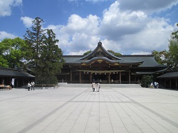 踏切を渡って表参道に入ると、長い直線のうっそうとした緑の参道が続いている。