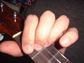 それでは楽器を叩いてみましょう。コーン、という乾いた響きの良い音が(だから違うっちゅうねん。)←本当にやらないで下さい。冗談ですので。(^^; 「ピック」という爪のようなものを使います。バンドのエレキギターとかでも使っていますね。(厳密に言うと、材質が違いますが)楽器を抱えて固定し、ピックを右手に持って、1対になっている2本の弦を一度に弾くことによって、音を出します。 |