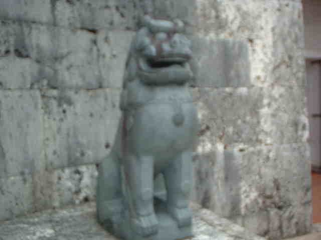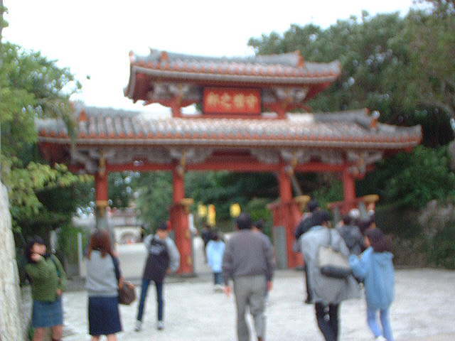 1月2日(1日目) ほぼ定刻通りに那覇空港に到着。気温16℃、これでも平年より低めらしいです。 1日目の目的地は、あの2000円札に描かれた守礼門のある首里城です。 はい、ネタのにおいがしますね。 宿泊予定のホテルに大きな荷物を置いて、バスで首里城公園へと向かいました。 バスには「2000円札は両替できません。」の表示が。 ・・・地元でも2000円札は使いにくいようです。 首里城公園に到着して、沖縄の民族衣装に身を包んだ ・・・これだけなの?もたれかかったら倒れるんじゃないのか、守礼門。(でも世界遺産。) 首里城に至るまでの道は、守礼門をはじめ、いくつかの門があるのですが、門のところに多くのシーサーが配置されていました。