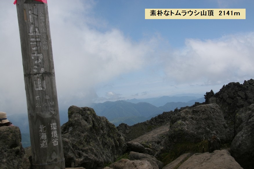 翌日、東大雪山荘を早朝に出発しトムラウシ山頂めざしあ。カムイ天上までひたすら登り、雲海の上に達ししばらく稜線を歩くと沢への急な下りが待っていた。沢で一休みすると再び登り返す、往復13時間を要したきつい山行であった。しかし山頂の雄大な眺めと広々としたお花畑に魅了され疲れはさほど感じなかった。 写真をクリックすると拡大します。